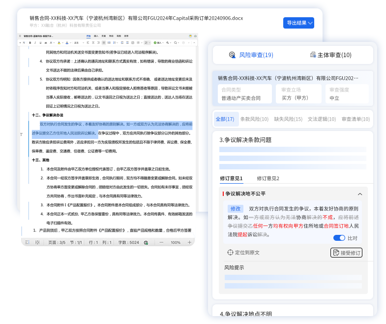 基于海量法律文书和数据训练的AI模型,智能识别关键风险点满足多行业 多类型的合同需求